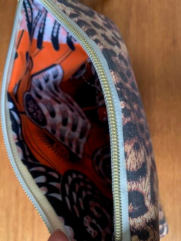 pochette motif léopard avec poignée assortie, fermeture éclair beige et métal doré, l'intérieur et doublé avec un wax togolais orange, ses dimensions 26/16